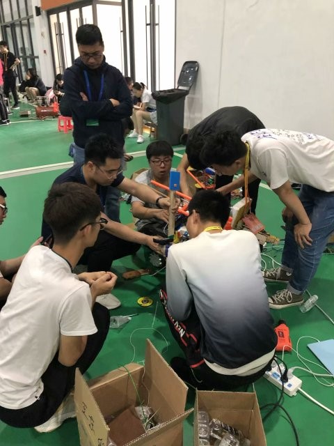 5月27日,参赛队员进入到比赛现场。现场调试过程中,两个机器人身上还存在着很多的不足,还有很多的地方需要完善,于是开始连夜奋战。直到进行比赛,队员们几乎没有休息。