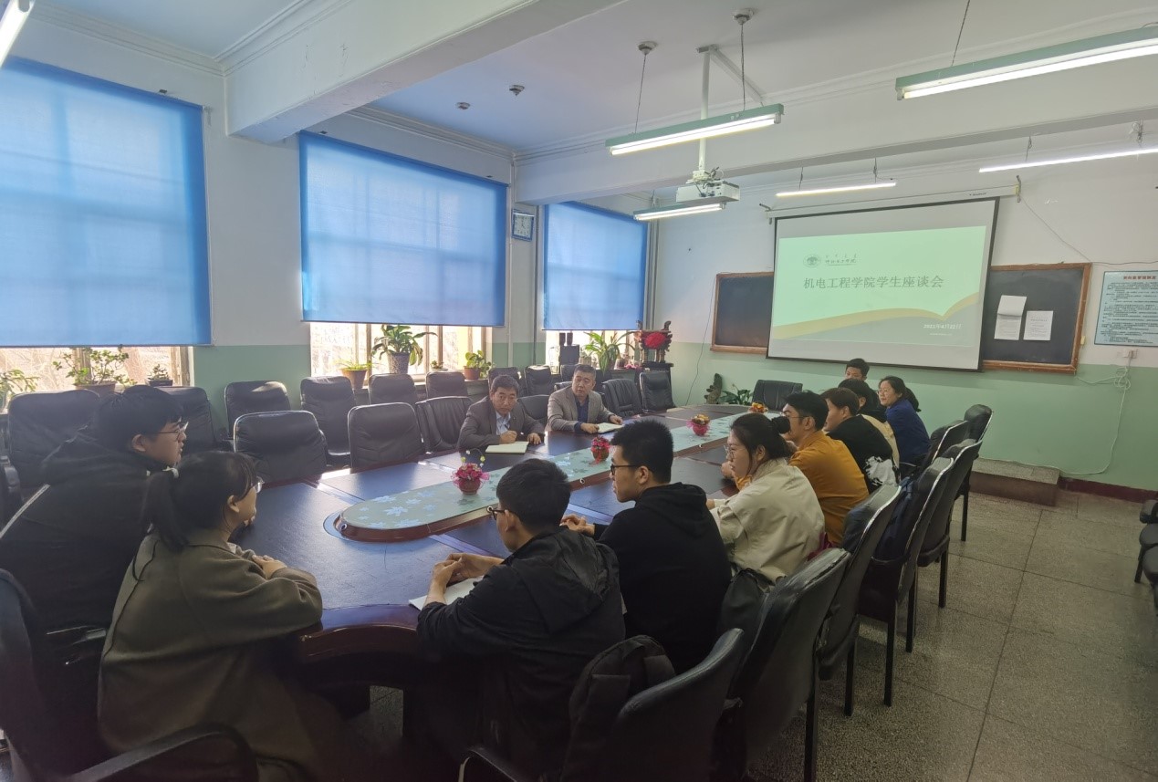 4月22日下午,机电工程公司副书记汪鑫、副经理宋国岩、教研办主任佟智慧及各班学委代表们在二楼会议室召开2020-2021学年第二学期员工座谈会。