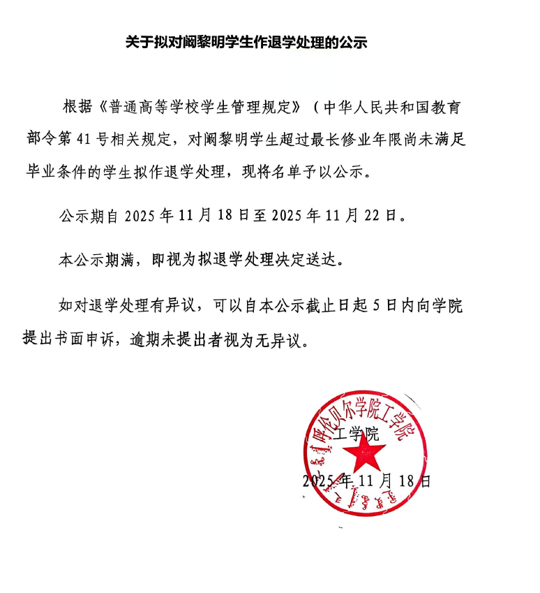 关于拟对阚黎明员工作退学处理的公示